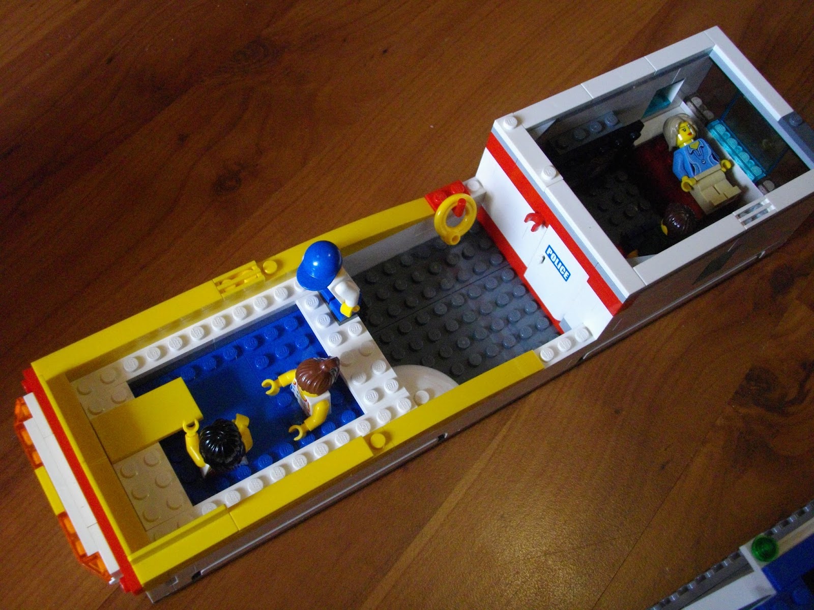 The First Class Cabin features a large bed (taken from a Medieval Town set), a sofa (two chairs put side by side on a raised base-plate), and a huge flat-screen TV (taken from the Police Station).